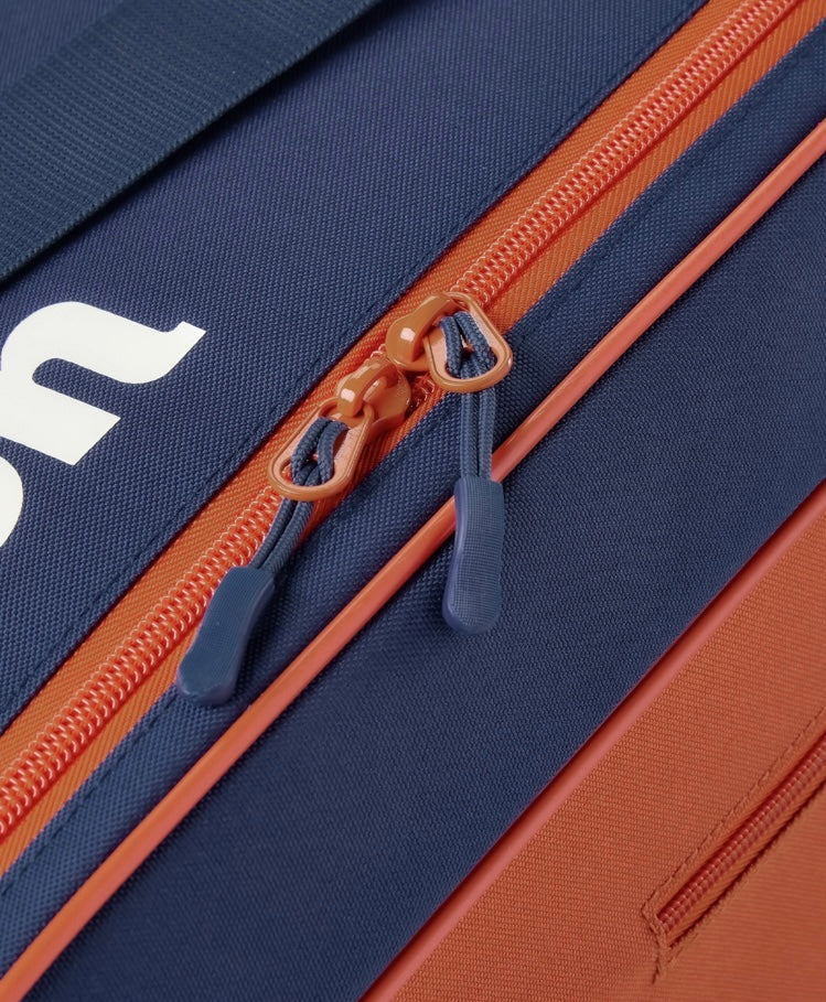 The Wilson Roland Garros Team 6 Pack Tennis Bag is a functional bag that exudes style. Two main compartments will hold up to 6 rackets and there is a zippered internal accessory pocket for your little items. Both sides of the exterior of the bag feature several accessory pockets to help keep more court essentials organized and easy to get to. The canvas-like material feels great and will be durable for everyday use. Carry it comfortably with the elongated grab handles.